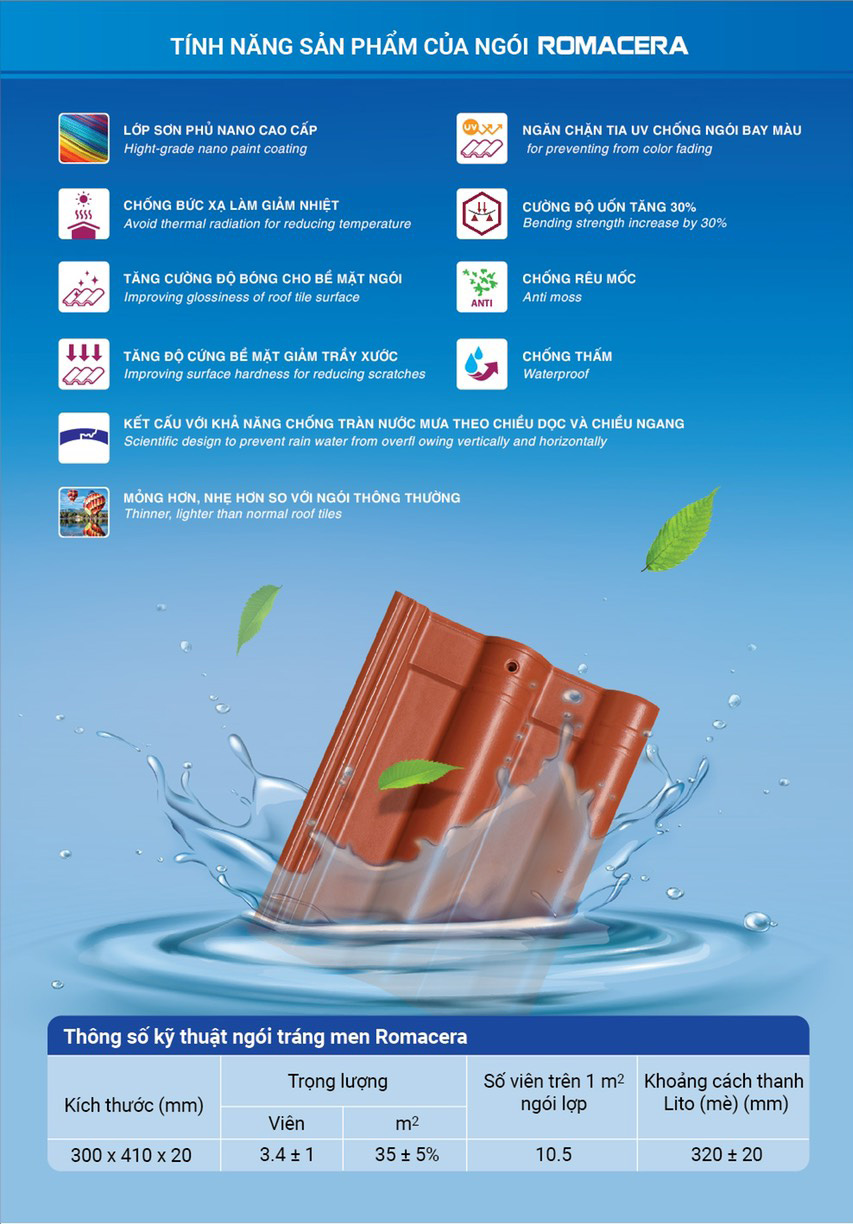 Ngói tráng men Romacera là loại ngói xương ceramic phủ men màu với màu sắc đa dạng, với công nghệ ceramic nên xương ngói thuộc loại sản phẩm bán sứ lại được tráng men nên mọi chỉ tiêu đều tốt gấp nhiều lần ngói đất sét nung thông thường. Sản phẩm có nhiều ưu điểm vượt trội như: